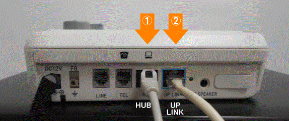 音声放送告知端末機の①「HUB」②「UP_LINK」の両方にLANケーブルが接続されている場合が該当します(電源アダプタ以外2本)